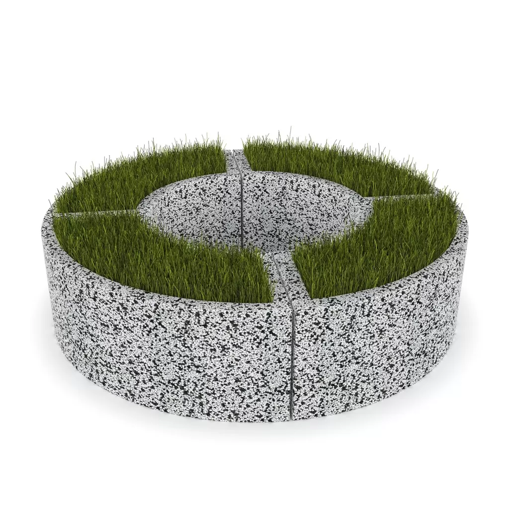 Оригинальный европейский вазон, легко вписывающийся в любой облик современного города, аккуратно подчеркивая все эстетические качества ландшафтного дизайна. Широкая цветовая гамма позволяет идеально подобрать цвет соответствующий окружающей среде. Идеально подходит для благоустройства городских площадей, парковых зон, а так же больших придомовых территорий. Техническое описание: Бетонно-монолитный вазон с фактурой из натурального камня. Изделие выполнено в виде четверти части от круга. Внешний фасад вазона имеет фактуру: мрамор , гранит, галька фракция от 3мм до 15мм или бетон, крашенный или пегментированный бетон. Составляется в полукруг из двух частей, в змейку из трех частей и в круг (или длинную змейку) из четырех частей.